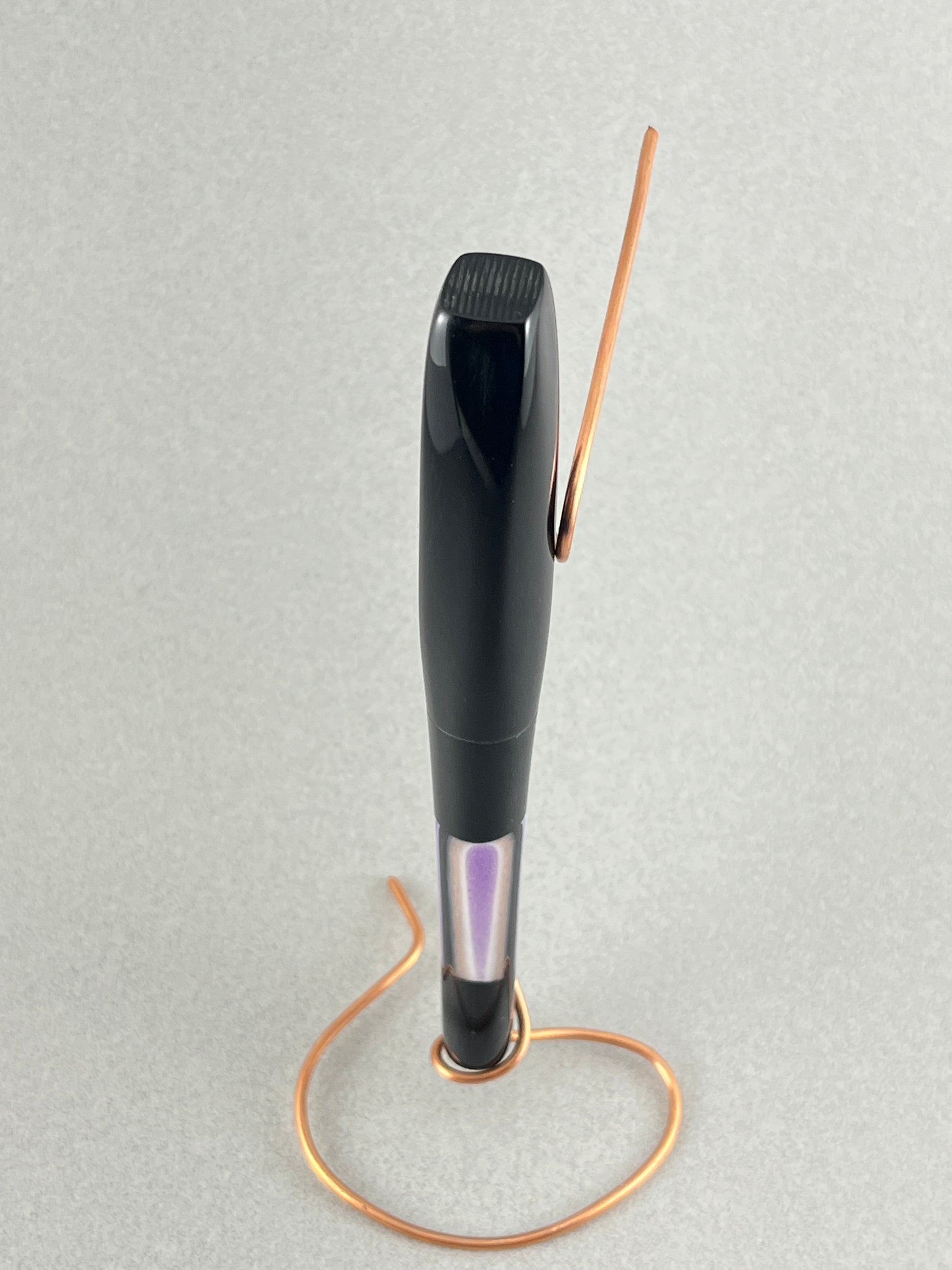 The cap has a subtle twist with the end at a slight angle with soft ridges. The barrel end has a slight angle with rough texture.